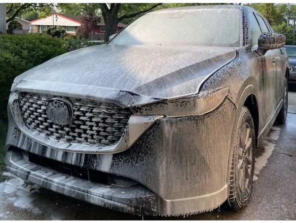 In the image to the right foam was applied with a foam cannon to start the contact wash. This process is the start to every wash.