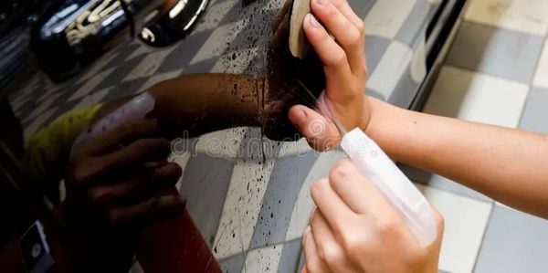 In the image to the left you can see a handheld polisher is in use to buff out scratches and apply wax.